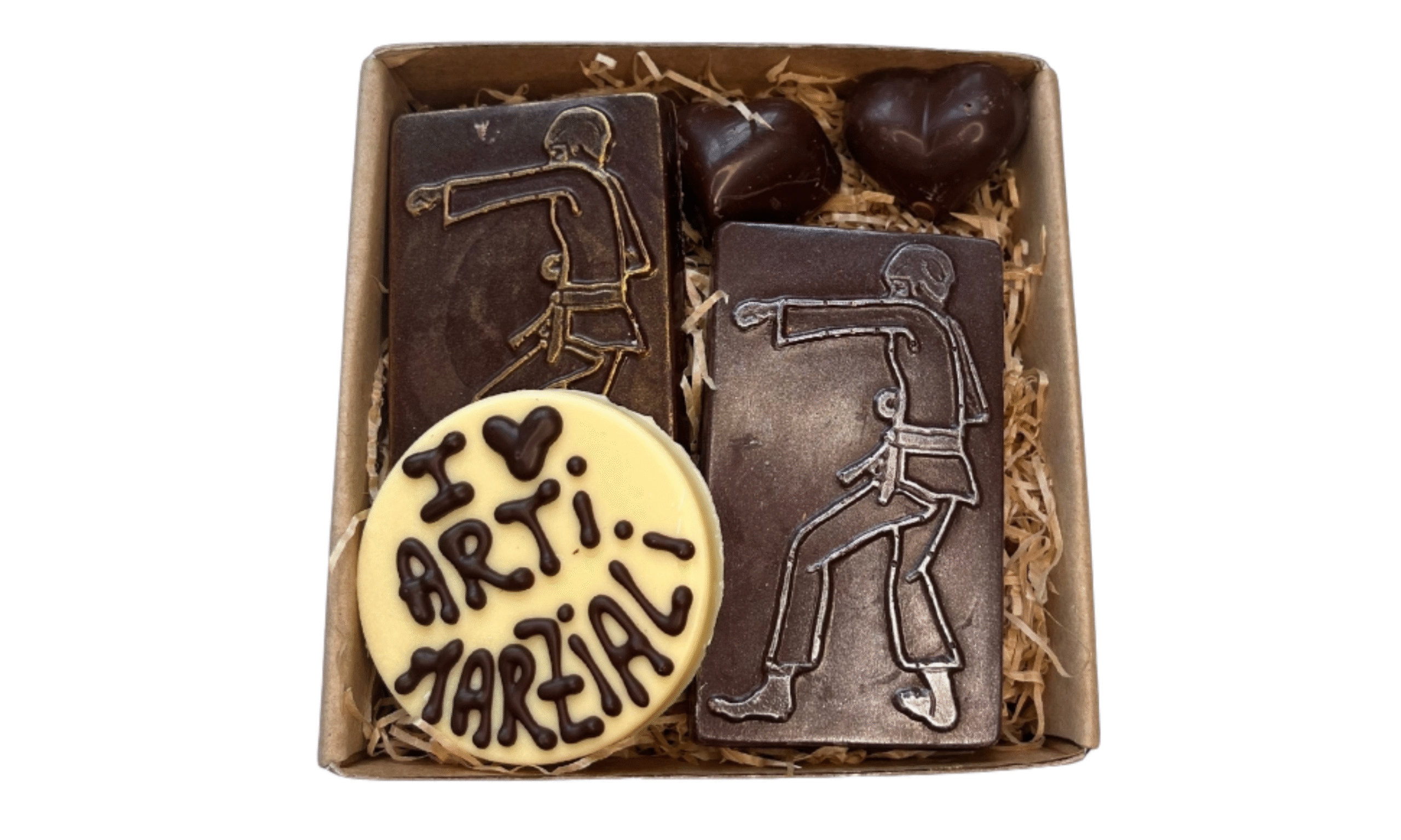 Il regalo ideale per appassionati di arti marziali .Nella scatola trovate 3 tavolette a tema in cioccolato misto