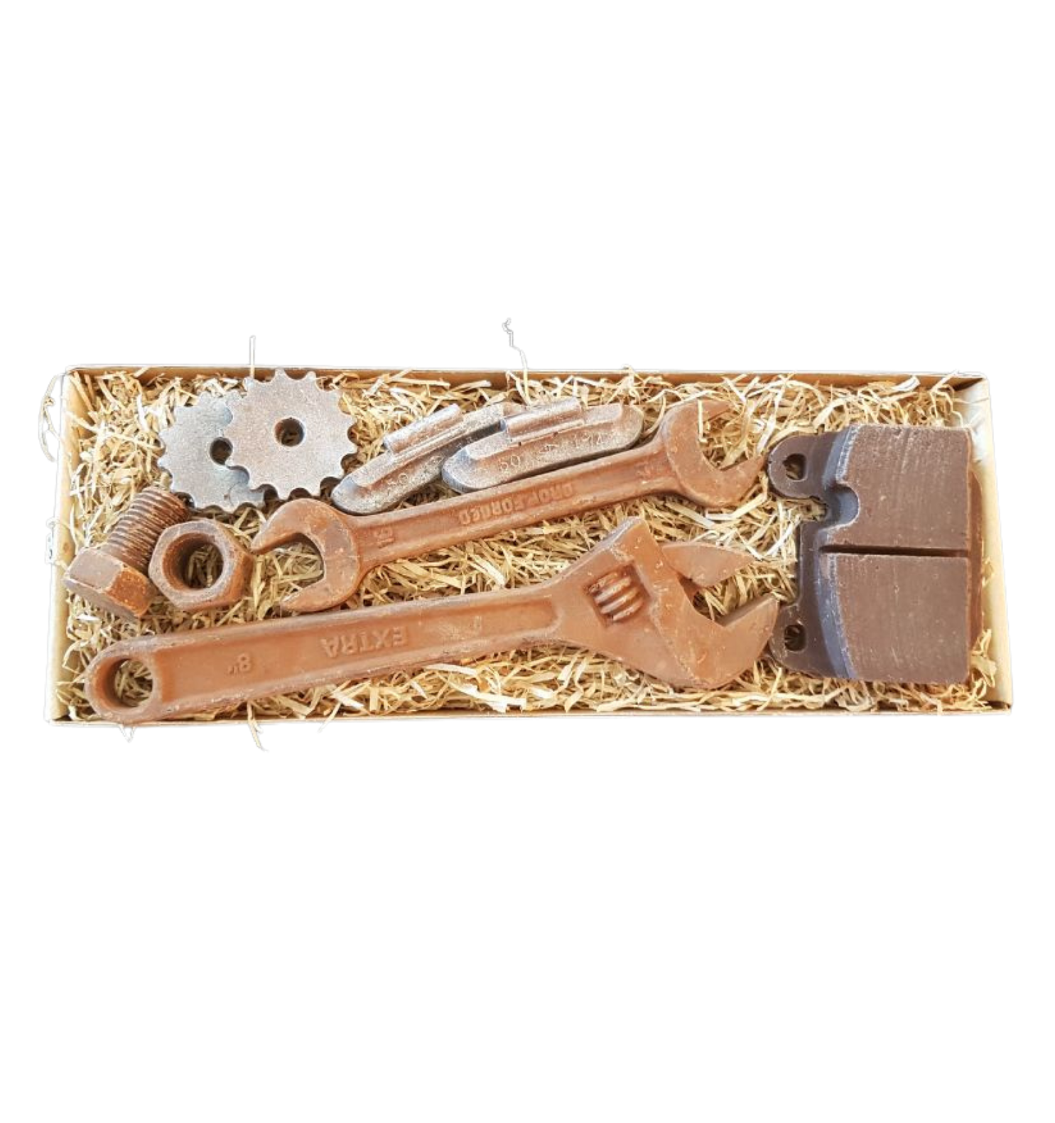La scatola contiene una serie di attrezzi, la pastiglia dei freni di un’auto e due pesini per la calibratura dei pneumatici in cioccolato fondente colorato leggermente a pennello con coloranti alimentari. Il regalo perfetto per chi ha sempre la macchina in panne o per il vostro meccanico di fiducia.