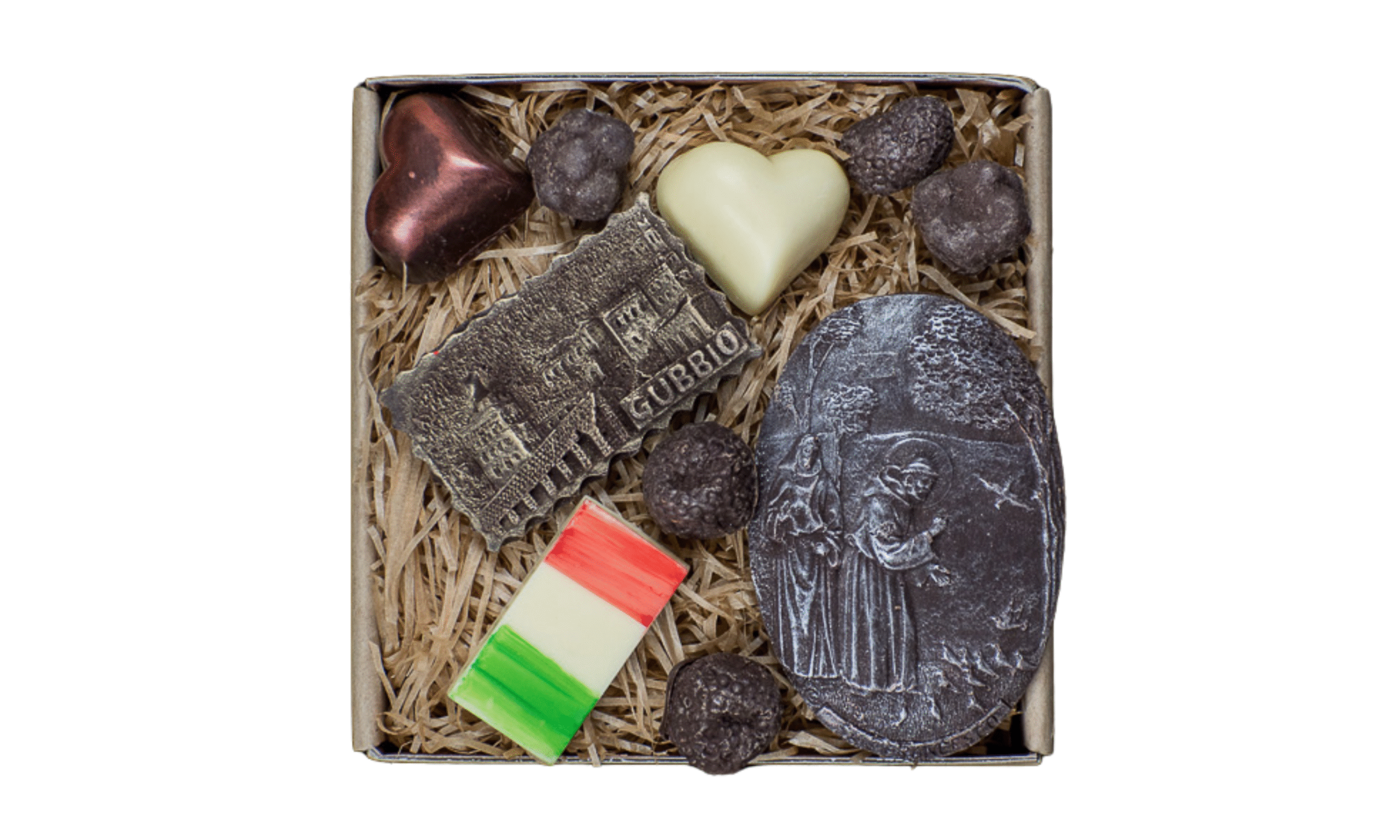 La scatola contiene i simboli dell’Umbria in cioccolato fondente colorato leggermente a pennello con coloranti alimentari e in cioccolato bianco. Il regalo perfetto per gli amanti di questa meravigliosa regione o perché no, un pensierino da abbinare alla prenotazione del vero viaggio!!